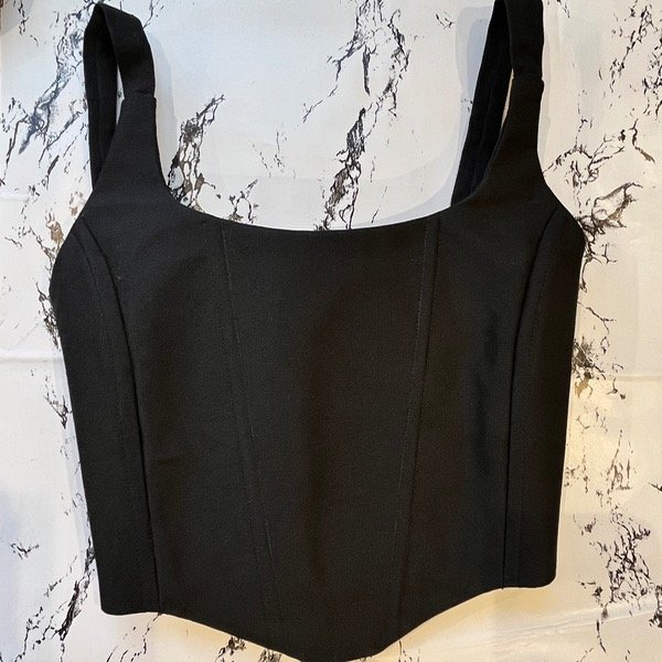 Corset de gabardina con ballena y cinta regulable en talle y hombros atados.